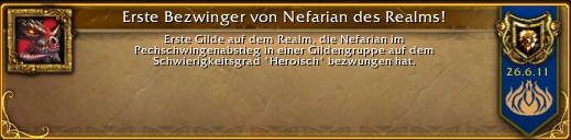 Kurz vor der Erstürmung der Feuerlande machen wir endlich einen Haken an den Pechschwingenabstieg im heroischen Modus. Nach endlosen Versuchen und einem unvergesslichen 1% Enrage-Wipe vorige Woche, zogen wir bis an die Zähne bewaffnet wieder und wieder gegen den störrischen Drachen und seine blitzende Schwester. Dann hat auf einmal alles gepasst und wir können uns Nemesis der Pechschwingen nennen.